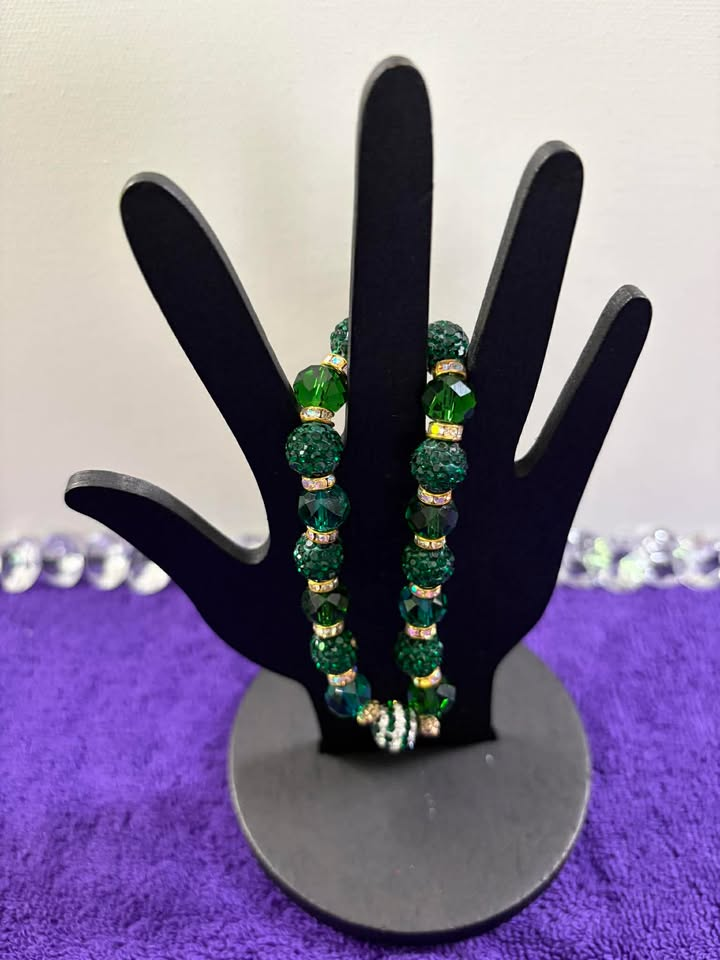 This luxurious stretch bracelet combines deep emerald green rhinestone pave fireball beads with matching faceted green crystal rondelle beads, all separated by gold-toned aurora borealis rondelle spacers. The dual-texture design smooth pave fireballs alongside sharply cut crystal rondelles creates a rich, layered look full of depth and sparkle. The emerald green color makes it ideal for festive occasions, St. Patrick’s Day, nature lovers, or anyone who loves jewel-toned accessories. Elastic stretch band for a comfortable, universal fit.