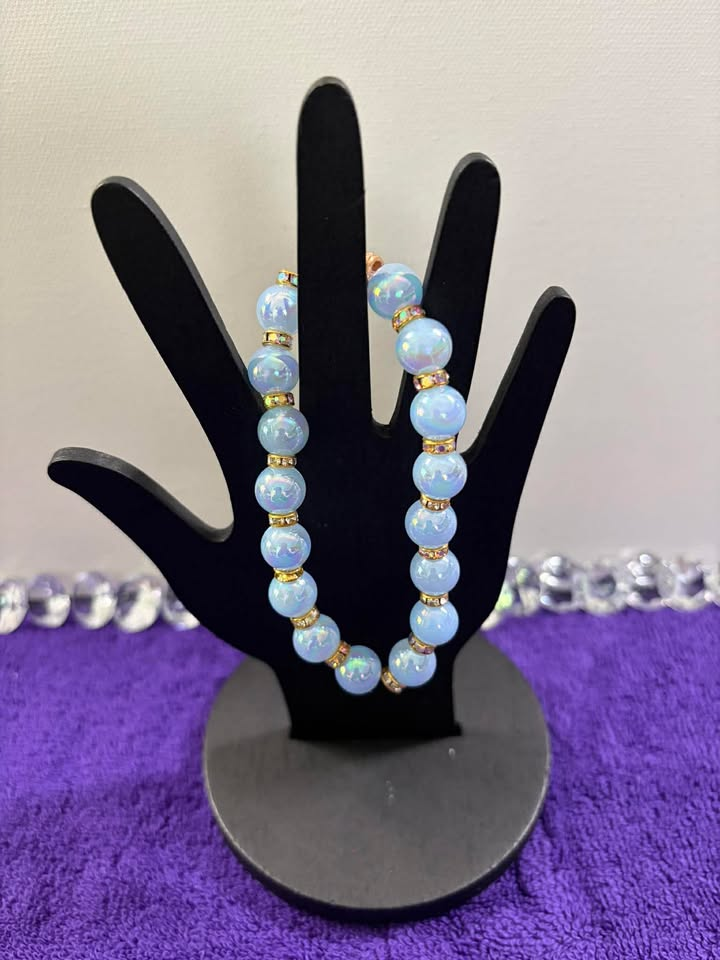 This enchanting stretch bracelet features large, smooth light blue opalite-style beads with a stunning iridescent glow that shifts colors in the light resembling moonstone or sea glass. Paired with gold-toned aurora borealis rondelle spacers, the overall effect is dreamy, ethereal, and magical. This piece is perfect for lovers of mystical or boho-inspired jewelry, and also works beautifully as a bridal or bridesmaid accessory. The soft blue tones complement a wide range of skin tones and outfit colors. Comfortable elastic stretch fit.