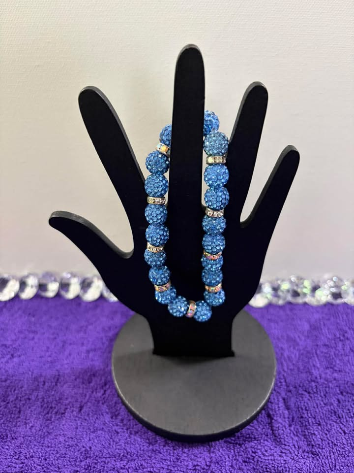 This stunning stretch bracelet features large sapphire blue rhinestone-encrusted pave fireball beads, alternated with colorful aurora borealis crystal rondelle spacers. The rich medium blue color of the crystals gives this bracelet a classic, sophisticated feel while still delivering plenty of sparkle. Perfect for everyday wear, casual outfits, or pairing with denim and blue tones. The AB spacers add a subtle rainbow shimmer that elevates the overall look. Comfortable elastic stretch fit for all wrist sizes.